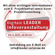 Eine Anmeldung ist per E-Mail an: info@leader-ortenau.de erforderlich. Die Zugangsdaten werden kurz vor dem Termin an die Teilnehmer*innen versendet