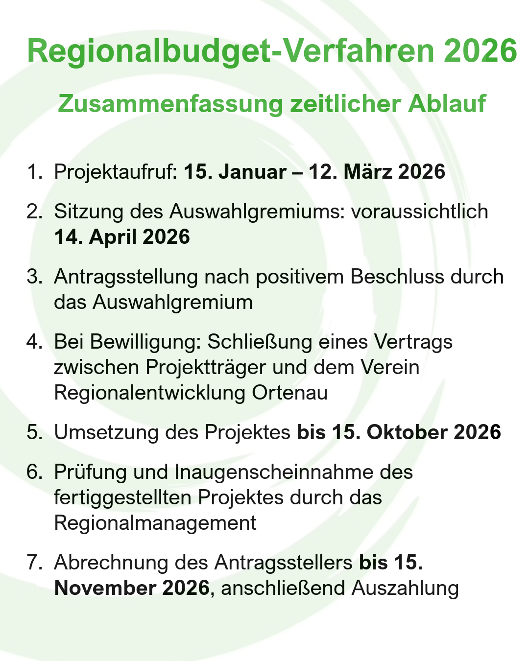 - Projektauswahlkriterien: Beim Regionalbudget gilt eine Mindestpunktzahl von 8 Punkten, um für eine Förderung in Frage zu kommen.